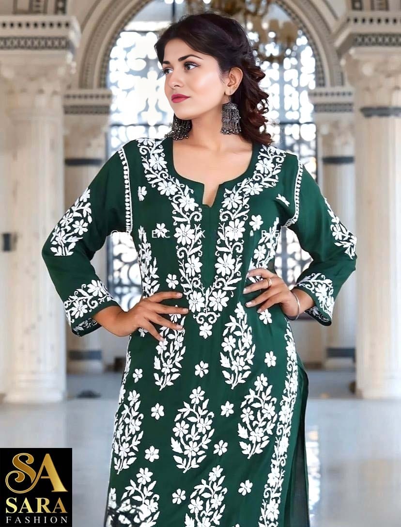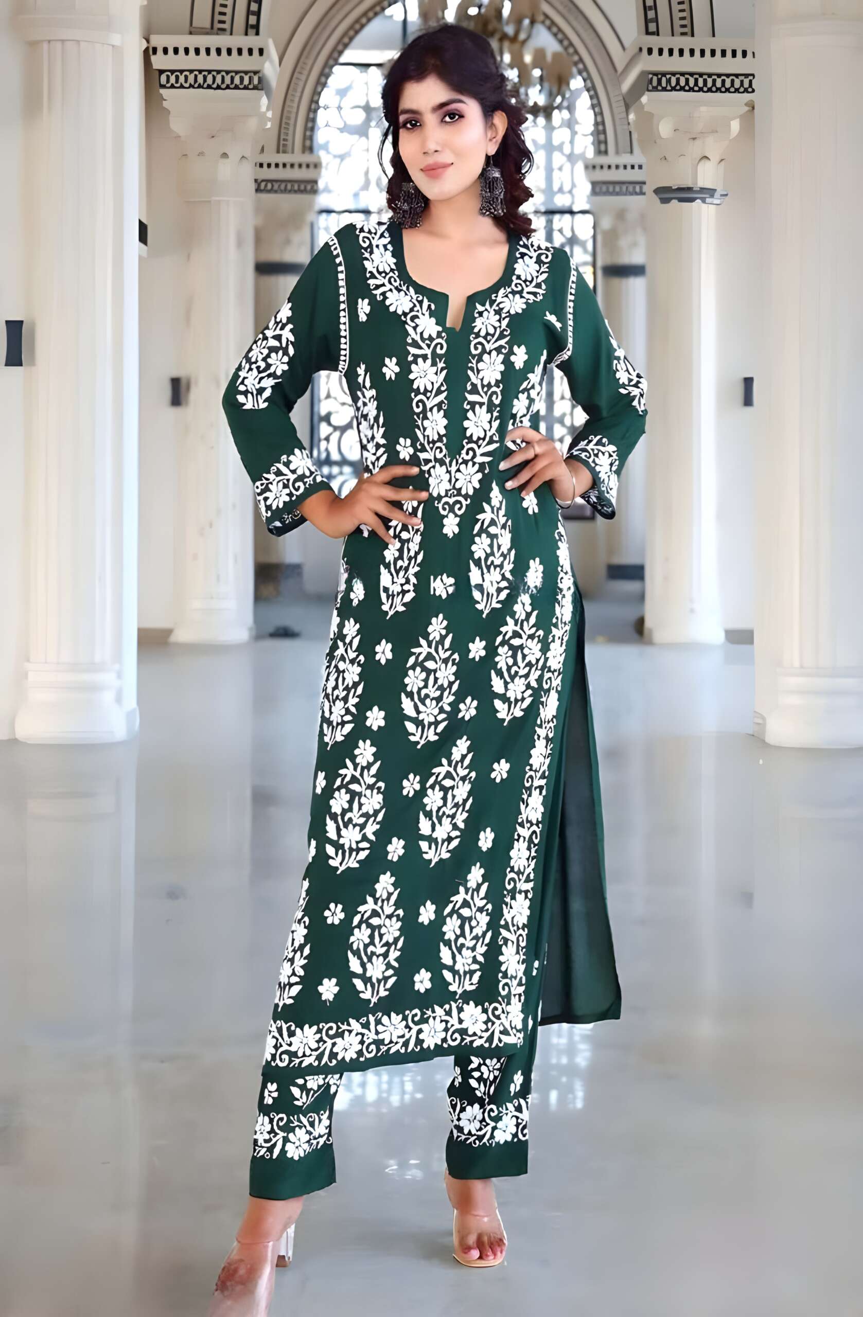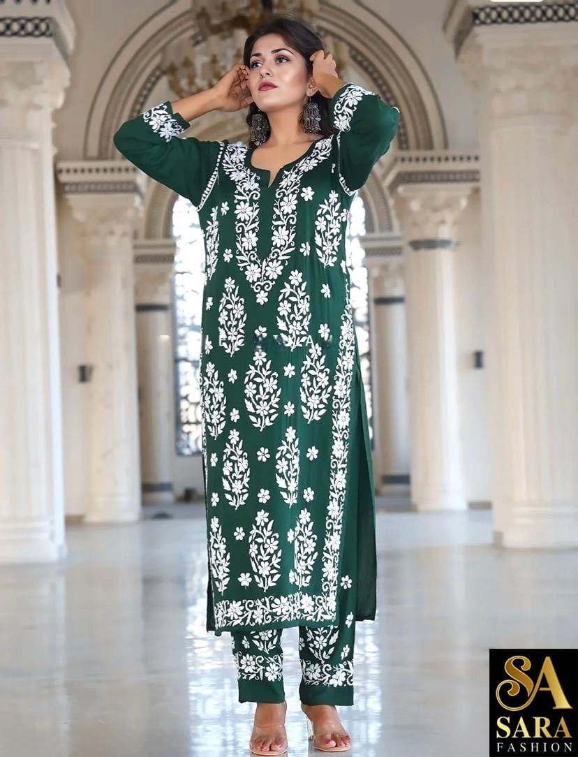 SHIA RAYON DARK GREEN CHIKANKARI KURTI PALAZZO SET