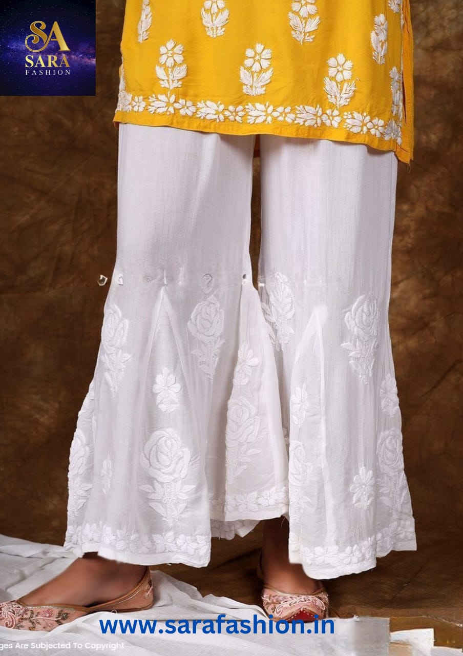 Step into a world of elegance and grace with our Rahat Modal white Chikankari Kalidaar Palazoo Bottom, a masterpiece crafted by Sara Fashion Designer Studio.