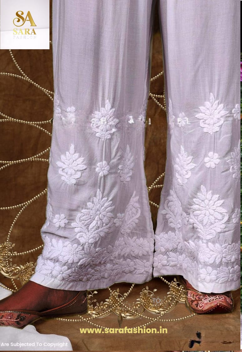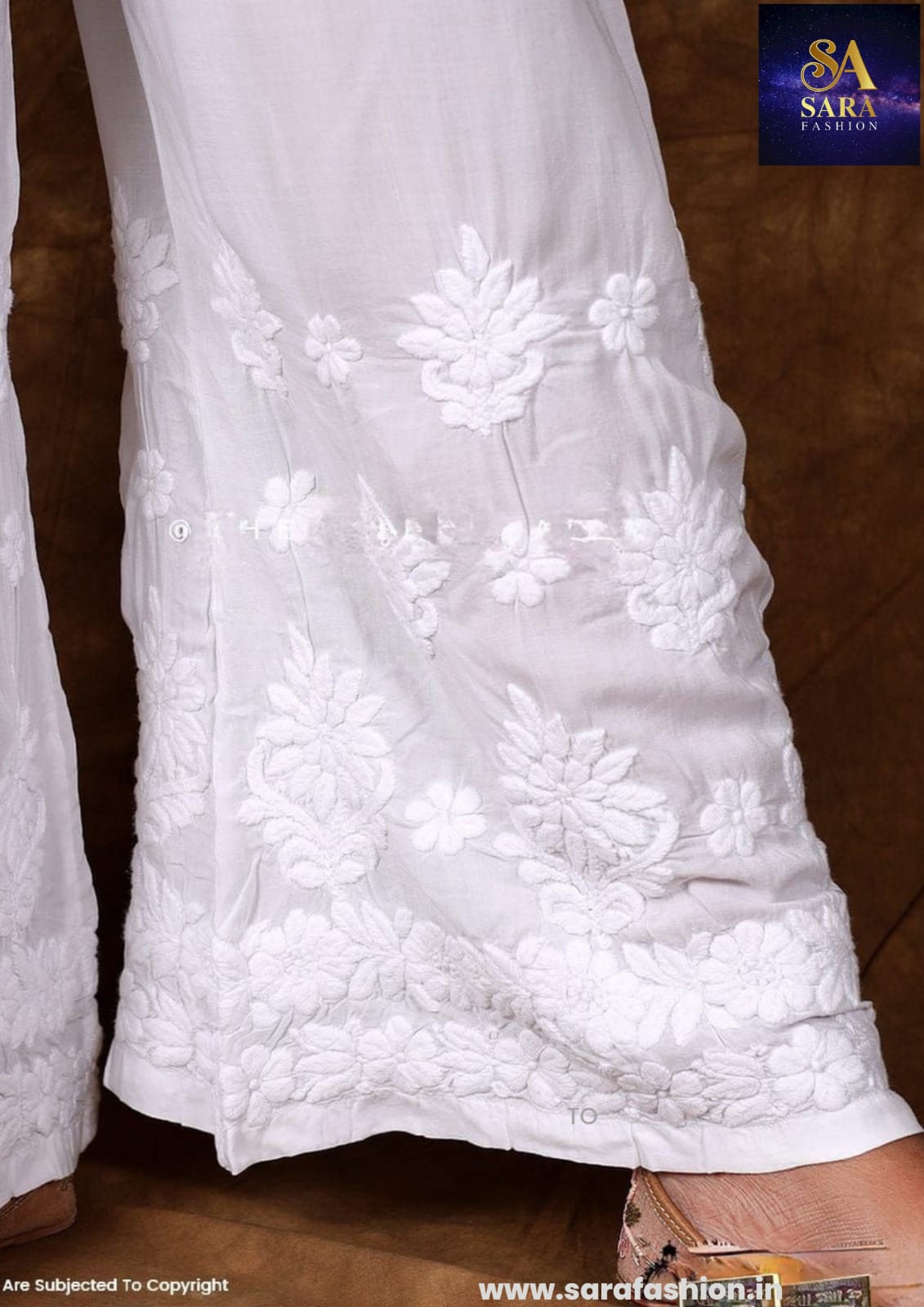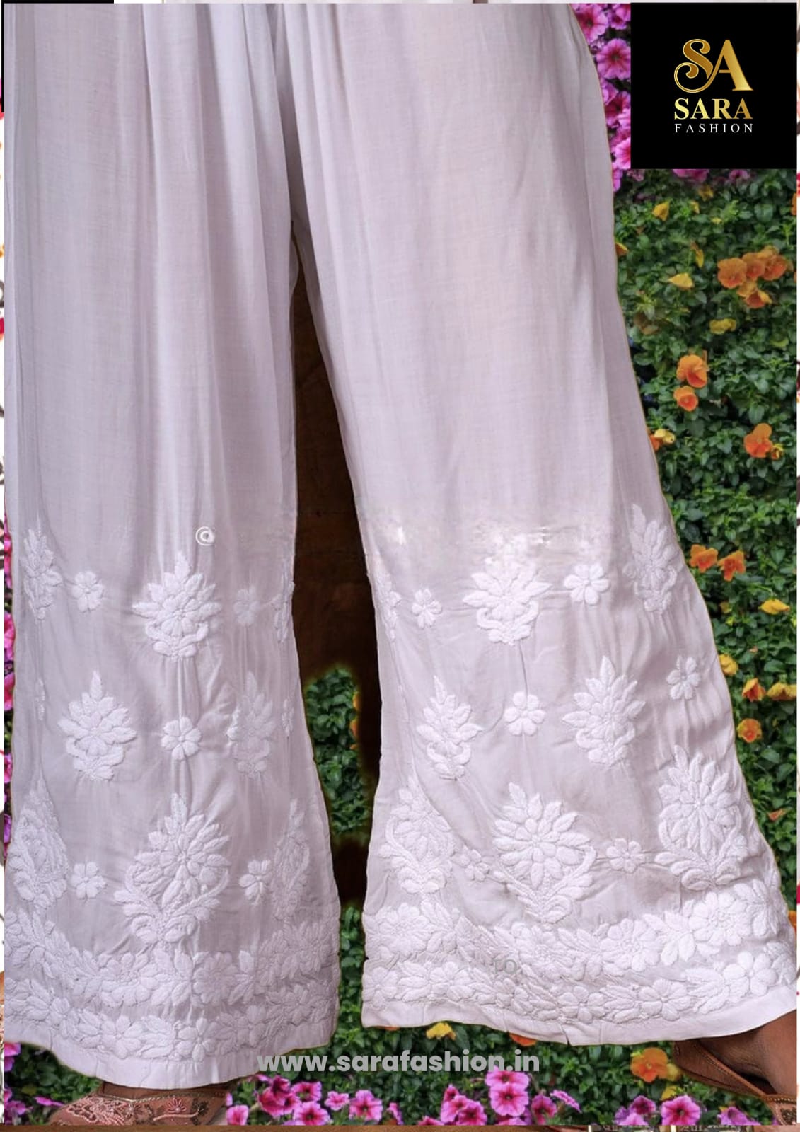 Introducing the ethereal Rania Rayon white Chikankari Straight Palazoo from Sara Fashion Designer Studio, a true embodiment of grace and elegance.